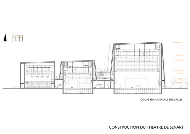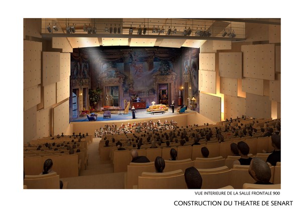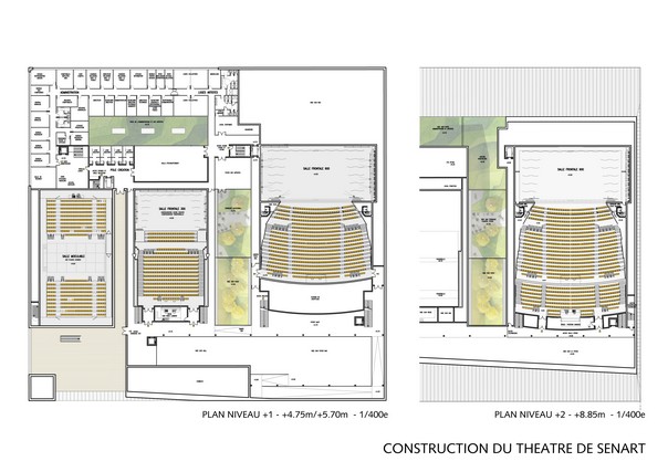 Bau einer neuen nationalen Bühne in Sénart. Raumprogram: 1 frontaler theater Saal von 900 Sitzplätzen + 1 Mehrzweckraum von 400 Plätzen.